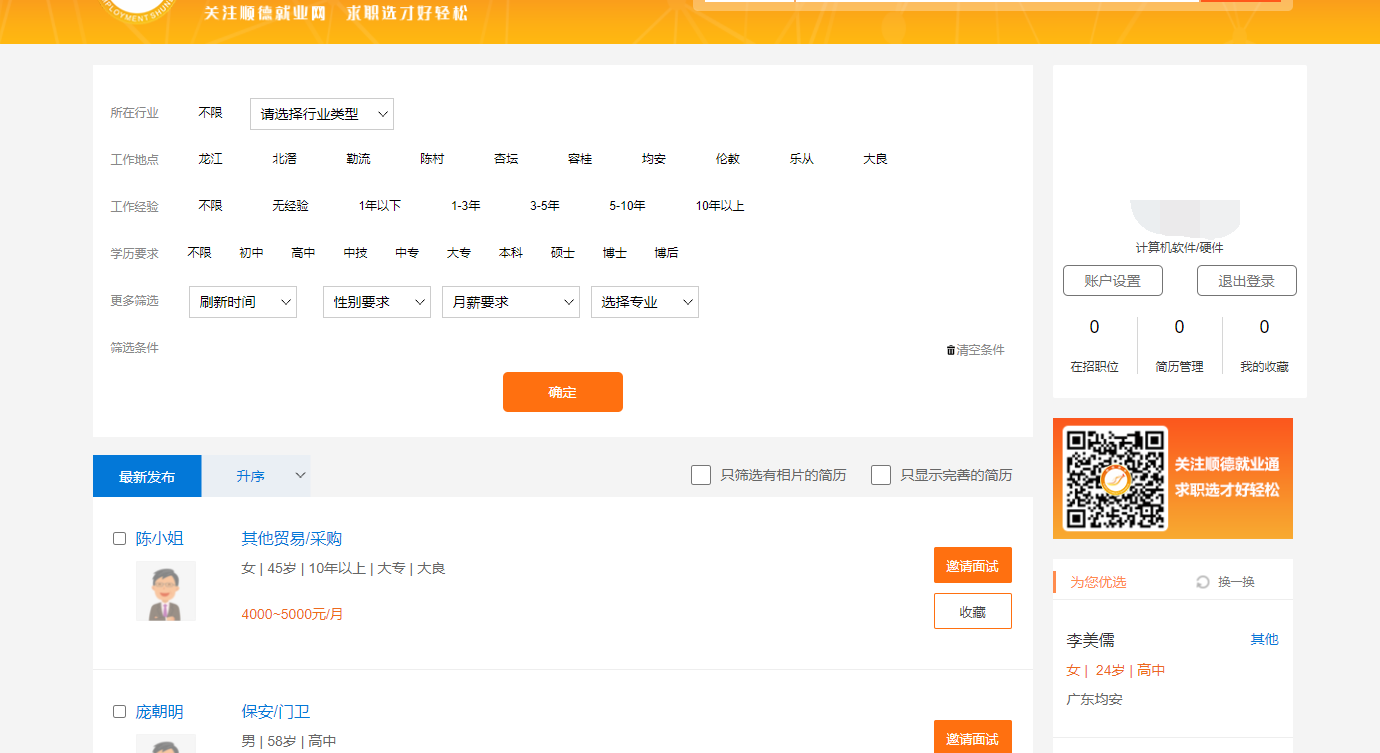 在个人求职的导航下,查找合适的人才,进行邀请面试。