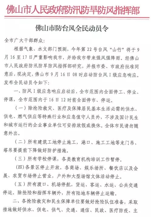 佛山市三防指挥部今日(9月16日)凌晨发布佛山市防台风全民动员令,佛山防台风Ⅰ级应急响应今日(16日)8时启动,全市停工、停业、停课、停市、停运。具体如下: