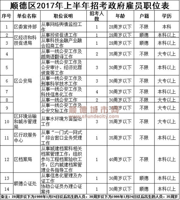 这次招聘的部门有区委宣传部、区经济和科技促进局、区公安局、区环境运输和城市管理局、区行政服务中心、区档案局、顺德公证处等,年龄大部分是35周岁以下,招考对象为社会人员,学历要求各不相同,户籍不限的为大多数。