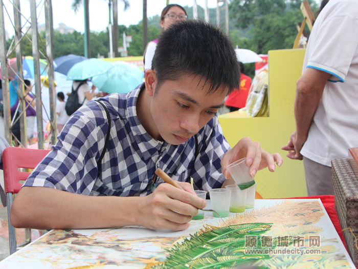 城网君在现场看到,残障人士展示的作品吸引了众多人围观。在社会企业观效文化-陈村北滘工作室的摊位,今年30岁的残障人士麦贵源正在低头认真地进行掐丝珐琅工艺画的制作。据北滘工作室主管冯锡华介绍,残障人士一般要经过两年左右的培训才能上手操作,目前北滘工作室有8名残障人士从事这项工作,一幅50cmX120cm左右的工艺画,市场价大概是6000至8000元。