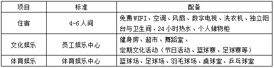 2、住房:免费入住公司宿舍,标准套间4-6人(水电气费用自理)。
