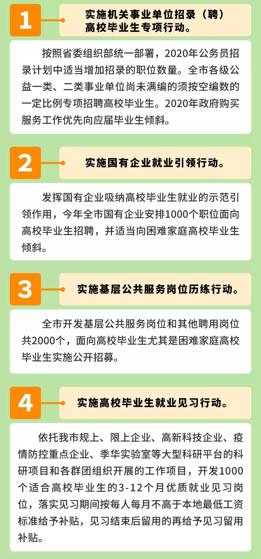 《通知》提出,实施机关事业单位招录(聘)高校毕业生专项行动。按照省委组织部统一部署,2020年公务员招录计划中适当增加招录高校毕业生的职位数量。集中开展事业单位公开招聘高校应届毕业生工作,全市各级公益一类、二类事业单位尚未满编的须按空编数的一定比例专项招聘高校毕业生。2020年政府购买服务工作优先向应届毕业生倾斜。