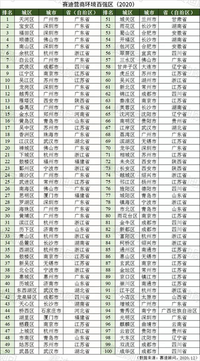 该榜单以市场主体和社会公众满意度为导向,重点关注企业创业发展所涉及的政府审批环节,从营商支撑、基础环境、要素吸引、服务便捷、城区活力五个维度综合评价各地营商环境优化成绩与营商综合服务水平,是赛迪顾问城市经济研究中心从全国(不包括港澳台)除直辖市市辖区外的898个市辖区中选出150多个综合实力较强、营商活动较为活跃的市辖区进入候选名单。其中,广东省表现尤为突出,共22个城区入选2020年赛迪营商环境百强区,其中广州天河区、深圳福田区、深圳宝安区位列前三名,顺德区则排名全国第四。