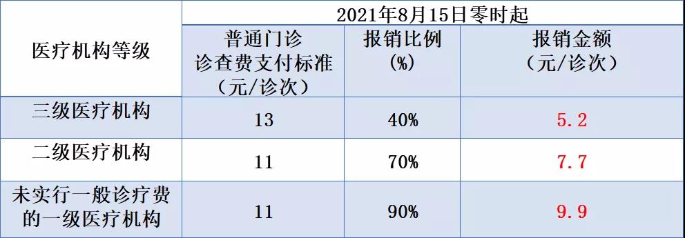 《诊疗项目目录》将“普通门诊诊查费”、“专家门诊诊查费”纳入医保支付并规定支付标准均按普通门诊诊查费收费标准执行。支付标准以内的部分,由医保基金和参保人按比例分担,超出支付标准的部分由参保人自付。据此规定,佛山市的基本医保普通门诊诊查费报销调整为支付标准乘以报销比例,见下表: