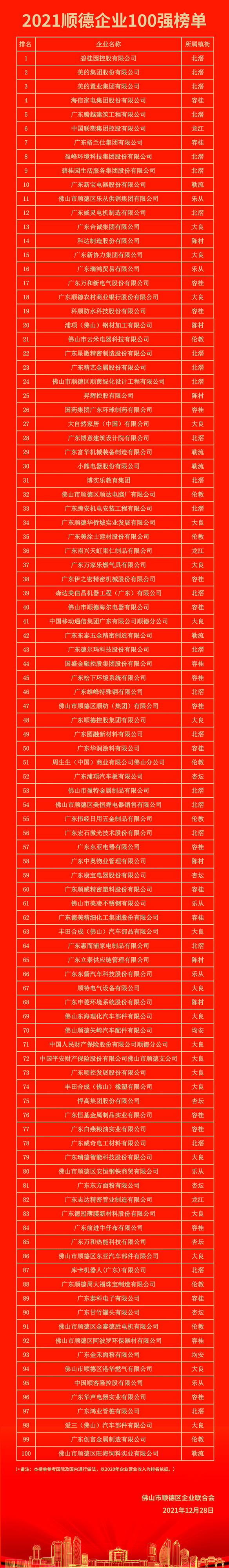 除此之外,榜单包含了“2021中国企业500强”榜单中的全部2家顺德企业、“2020广东企业500强”榜单中的全部18家顺德企业、“2021佛山企业100强”榜单中的全部31家顺德企业。