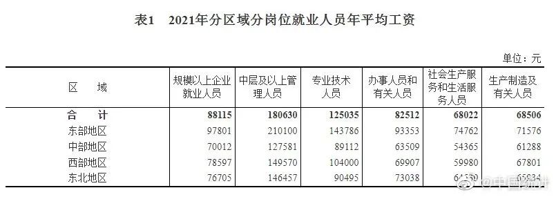 5月20日,国家统计局发布2021年平均工资数据,2021年全国规模以上企业就业人员年平均工资为88115元,比上年名义增长10.3%。其中,中层及以上管理人员180630元,增长9.5%;专业技术人员125035元,增长11.1%;办事人员和有关人员82512元,增长9.8%;社会生产服务和生活服务人员68022元,增长9.8%;生产制造及有关人员68506元,增长9.4%。中层及以上管理人员平均工资最高,是全部就业人员平均水平的2.05倍;社会生产服务和生活服务人员平均工资最低,是全部就业人员平均水平的77%。岗位平均工资最高与最低之比为2.66,与上年持平。