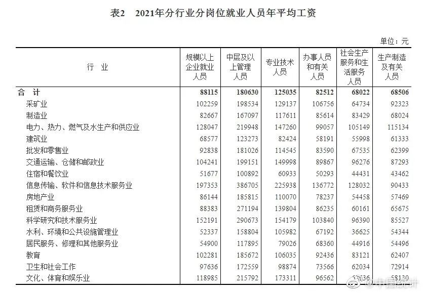 分行业门类看,中层及以上管理人员、专业技术人员、办事人员和有关人员、社会生产服务和生活服务人员四类岗位平均工资最高的行业均为信息传输、软件和信息技术服务业,平均工资分别为386705元、225938元、136772元、128032元;生产制造及有关人员平均工资最高的行业是电力、热力、燃气及水生产和供应业,平均工资为115134元;中层及以上管理人员、专业技术人员、办事人员和有关人员、生产制造及有关人员四类岗位平均工资最低的行业均为住宿和餐饮业,平均工资分别为100892元、60933元、50293元、43462元;社会生产服务和生活服务人员平均工资最低的行业是水利、环境和公共设施管理业,平均工资为36625元。