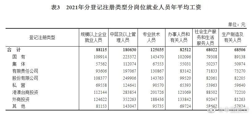 分登记注册类型看,中层及以上管理人员、办事人员和有关人员、社会生产服务和生活服务人员三类岗位平均工资最高的企业类型均为外商投资企业,平均工资分别为352263元、133842元、92047元;专业技术人员平均工资最高的是港澳台商投资企业,平均工资为201726元;生产制造及有关人员平均工资最高的是国有企业,平均工资为89138元;中层及以上管理人员、专业技术人员、办事人员和有关人员、社会生产服务和生活服务人员、生产制造及有关人员五类岗位平均工资最低的企业类型均为集体企业,平均工资分别为112074元、67553元、55031元、50237元和50974元。