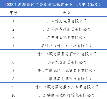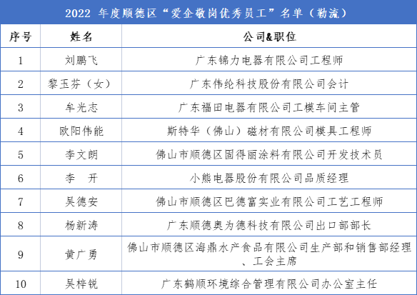 9月20日,由顺德区总工会、区工商业联合会、区民政和人力资源社会保障局联合主办的2022年顺德区“双爱双评”先进典型发布仪式在顺峰山公园举行,揭晓百家“顺德区关爱员工的先进企业”、百名“顺德区爱企敬岗的优秀员工”。勒流街道共有10家企业上榜“顺德区关爱员工的先进企业”,10名企业职工上榜“顺德区爱企敬岗的优秀员工”。