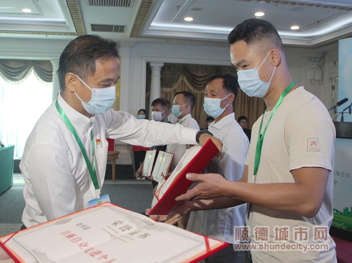 顺德区民政和人力资源社会保障局党组副书记、残联理事长吴力向自立自强残疾人颁发证书。