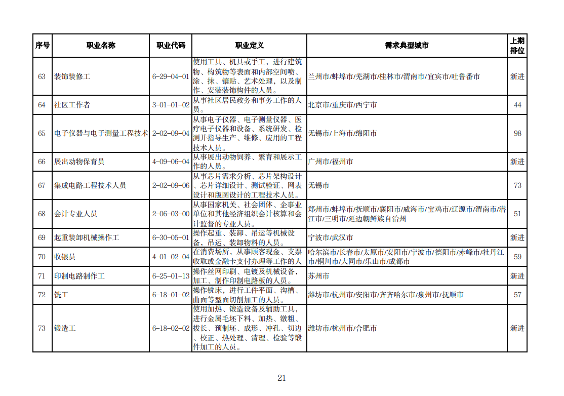铆工、锻造工、模具工等职业新进“最缺工”100个职业排行,车工、焊工位列排行前十,电机制造工、仪器仪表制造工、汽车生产线操作工等缺工程度较二季度有所增加;物流及运输行业缺工程度有所增加,邮政营业员、道路客运服务员新进排行,快件处理员、道路货运汽车驾驶员、装卸搬运工等职业缺工程度加大。