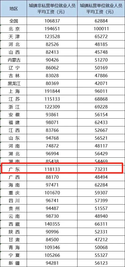 其中广东城镇非私营单位就业人员平均工资为118133元,城镇私营单位就业人员平均工资为73231。