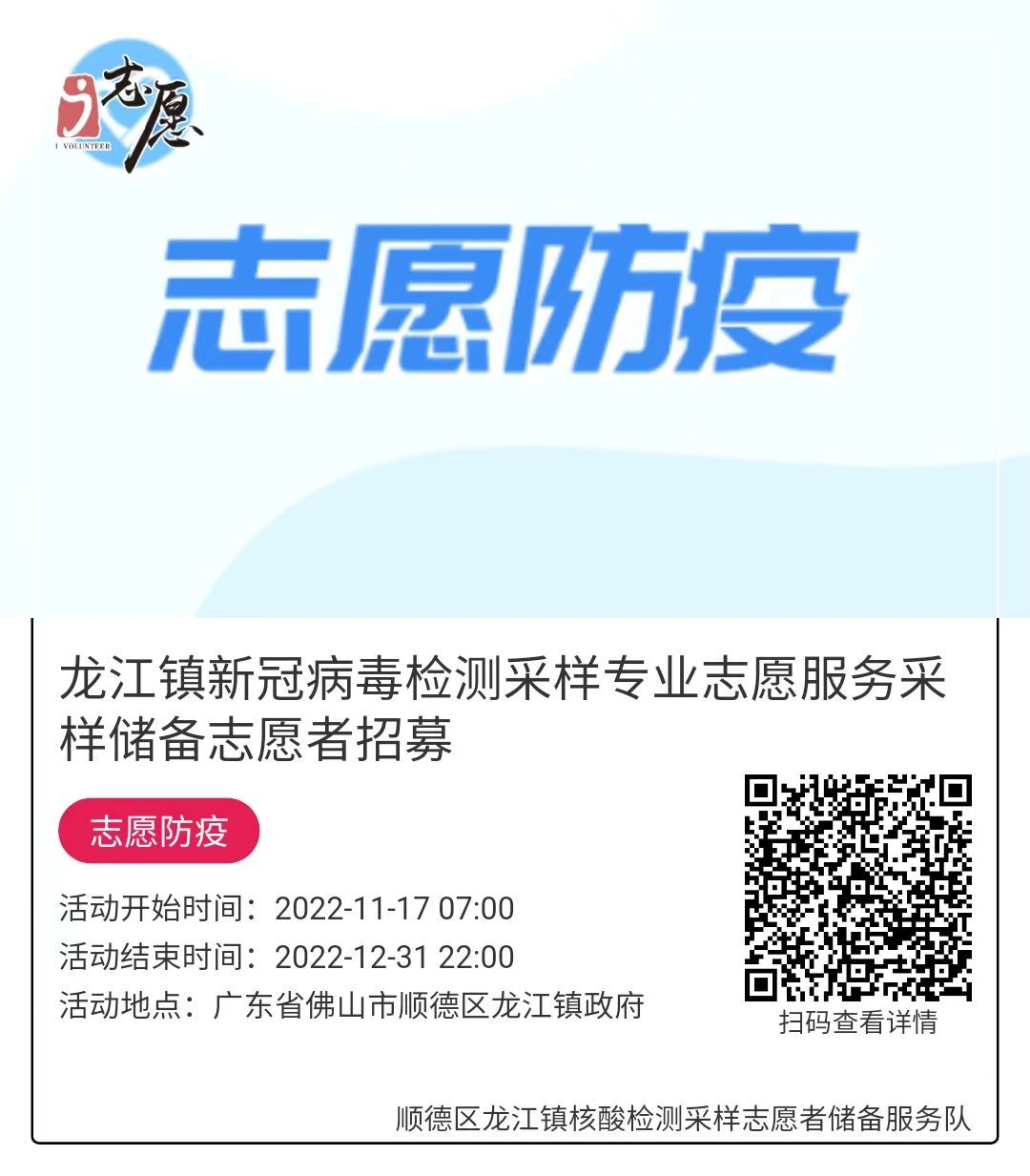为进一步充实核酸采样力量,根据省卫生健康委、团省委印发《广东省新冠病毒核酸采样专业志愿服务工作方案》,着力统筹调配社会面志愿服务力量,建立具备规模的核酸采样志愿者队伍,充实核酸采样力量储备,提高核酸采样能力,龙江镇团委、镇志联面向全镇开展“志愿采”核酸采样专业储备志愿者招募工作。
