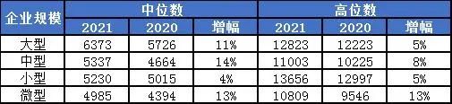2022年各规模企业的中位数和高位数全部有所上升,中位数涨幅最高的为“中型企业”,上涨14%,高位数涨幅最高的是“微型企业”,上涨13%。