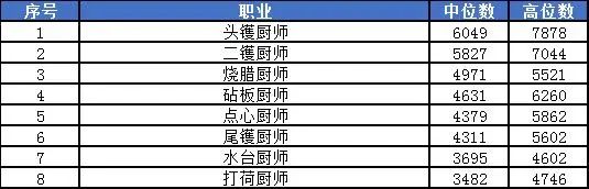 “粤菜师傅”中位数最低为“打荷厨师”,为3482元,但随着技能的增加,薪酬也会相应增加,“头镬厨师”的高位数为7878元,再努力一把,技术入股,有房有车,成为老板的人也不在少数。