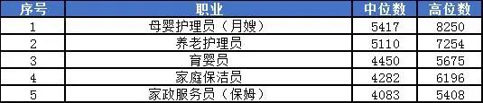 家政业月薪中位数最低的“家政服务员(保姆)”已经不在月薪3千的行列了,为4083元。“母婴护理员(月嫂)”,中位数为5417元,高位数为8250元。