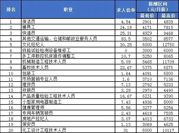 需求大于求职缺口最大的前20个职业中,主要由商业和服务业以及制造业的工种组成,其中缺口数最大的前三个职位是保洁员、模具工和快递员。