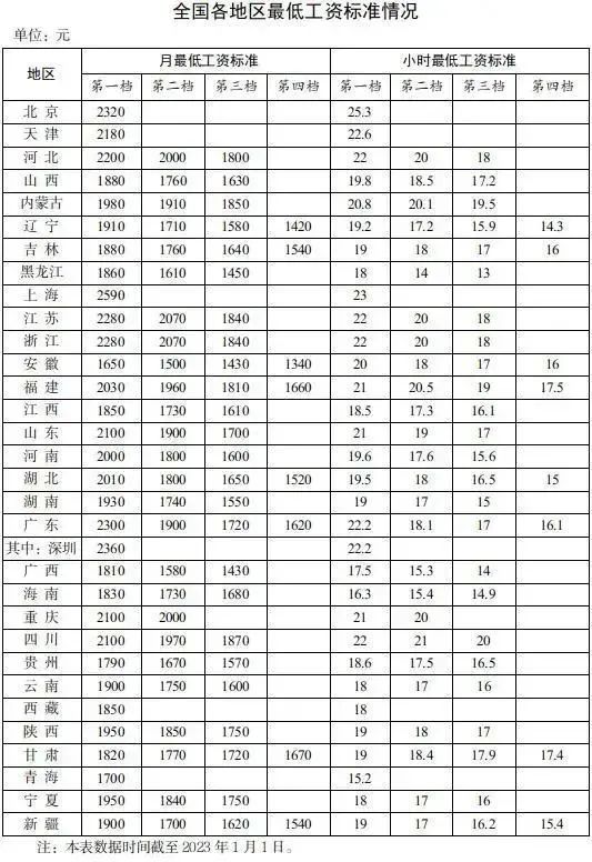 全国各地区最低工资标准情况(截至2023年1月1日),来自人社部网站