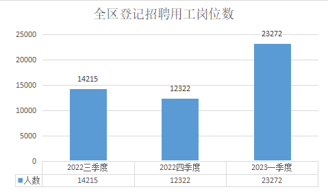 2023年一季度,据全区500家用工定点监测企业数据统计,监测企业目前在岗人数约为242495人,比上季度252234人减少9739人,企业新招用人数23272人,同比下降11.8%。反映顺德企业招聘用工相对保守,以稳定现有员工为主,招聘意欲不强。