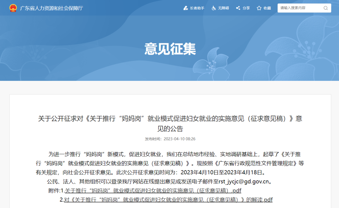 近日,广东省人社厅针对“妈妈岗”发布了《关于推行“妈妈岗”就业模式促进妇女就业的实施意见(征求意见稿)》(下称《征求意见》),鼓励用人单位拿出部分专业技术和管理岗位用于“妈妈岗”设置,鼓励引导“妈妈岗”实行灵活上班和弹性工作的方式。并就“开发‘妈妈岗’岗位”“加强‘妈妈岗’就业服务”“加强劳动权益保障”等方面向社会公开征求意见。