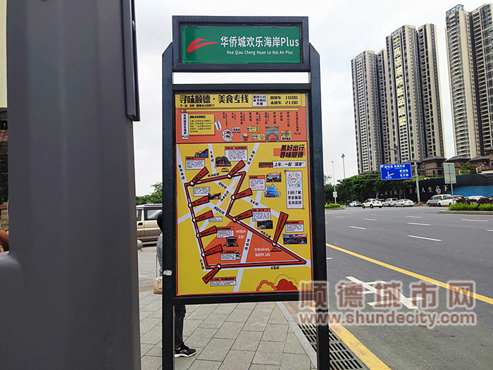 美食专线将途经10大顺德美食景点:华侨城欢乐海岸PLUS、苏岗(顺峰山公园南门)、大吉(宝林寺)、凤城食都(龙的酒楼)、美食城、第一码头(凤城酒店)、金榜上街(体育中心)、钟楼公园、印象城、顺峰山公园。