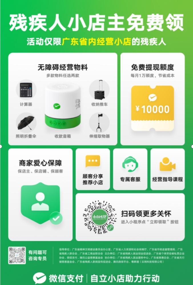 微信支付将为“自立小店”免费提供六大专属关怀:零手续费提现额度;无障碍经营工具关怀礼包;数字经营培训;开通顾客分享推荐小店功能;商家爱心保障;专属客服一对一咨询服务。让残疾人小商家开店无障碍、经营有保障。