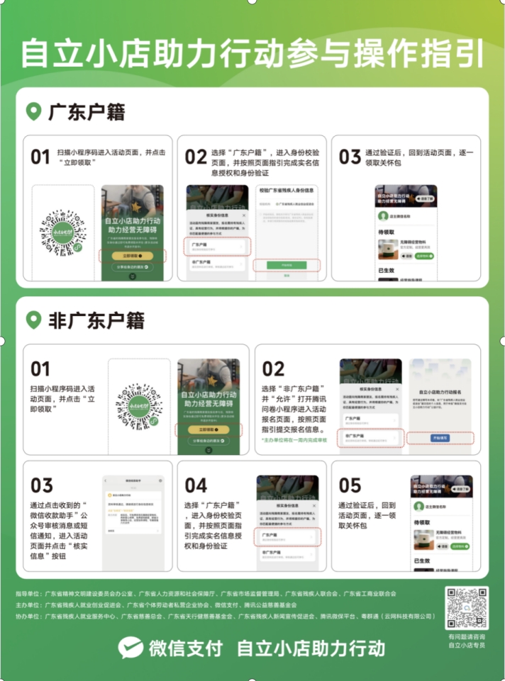 2022年底,“自立小店”助力行动在深圳、东莞、中山三座城市率先落地。目前,该活动已经正式在全省开展。在广东省内经营线下门店(原则上以工商登记信息为准,含非广东籍),持有效《中华人民共和国残疾人证》的残疾人小商家,可通过“广东残联”公众号,点击底部菜单“微服务”-“自立小店”,或扫描活动海报中的小程序码进入活动页面,在线上页面进行资格审核,符合微信支付个人收款码经营收款行为即可参与活动。