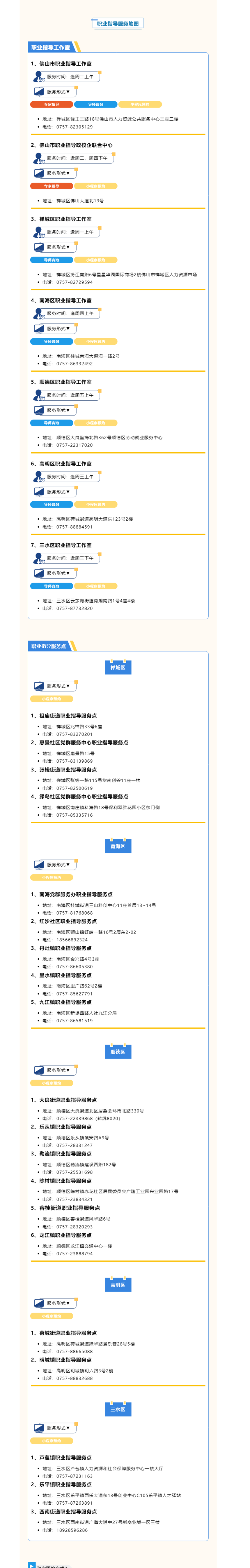 您不仅可以前往身边的职业指导工作室/服务点,还可通过“佛山职有你”小程序进行线上预约,来选择适合你的方式进行咨询,快来预约吧!