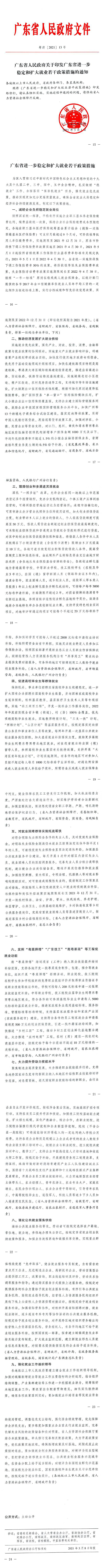 广东省人民政府关于印发广东省进一步稳定和扩大就业若干政策的通知(粤府【2021】13号)