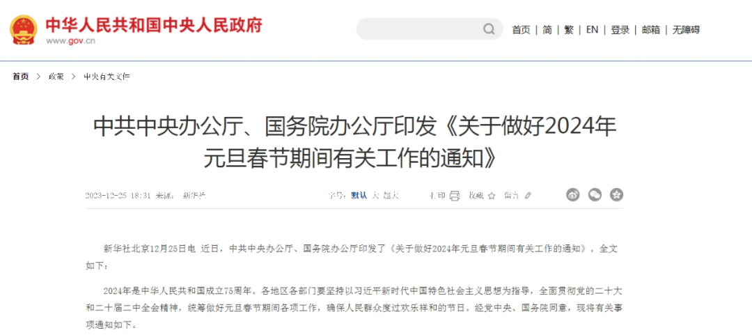 近日,中共中央办公厅、国务院办公厅印发《关于做好2024年元旦春节期间有关工作的通知》,要求各地各部门筹做好元旦春节期间各项工作,确保人民群众度过欢乐祥和的节日。