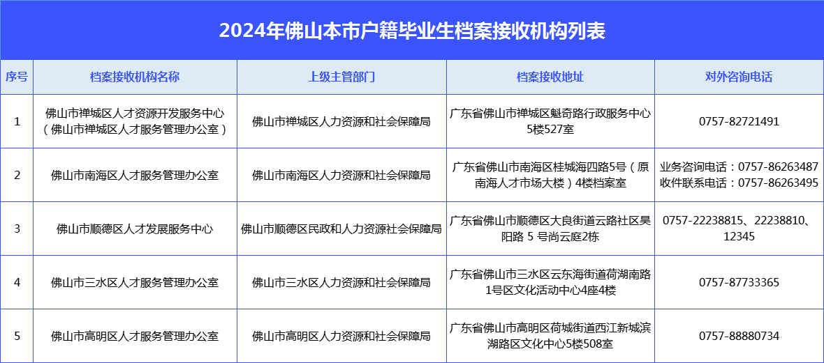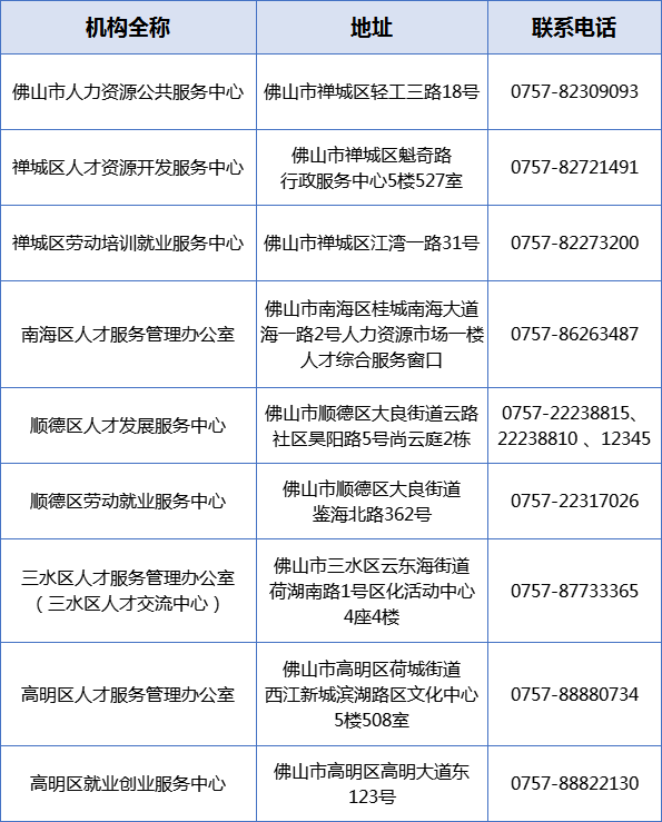 或者致电户籍地或就业地档案管理服务机构进行查询,佛山市及各区流动人员人事档案管理服务机构联系方式如下表: