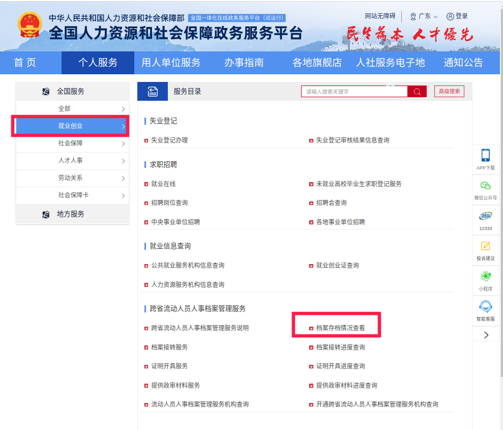 登录全国人社政务服务平台(http://zwfw.mohrss.gov.cn/)并注册,在“就业创业”板块的“跨省流动人员人事档案管理服务”专栏进行查询。目前,该平台支持档案基础信息数据已被上传平台的流动人员在线查询存档情况。