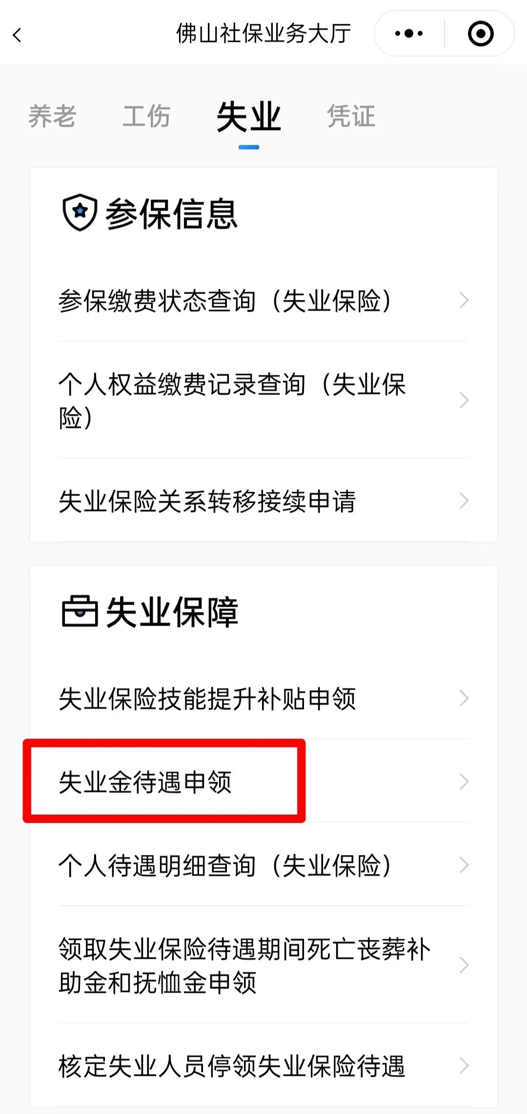 登录小程序,左上角定位选择“佛山市”,依次点击“社保”→“失业”→“失业金待遇申领”,进入菜单目录后选择“失业金待遇申领”,按照页面提示进行操作即可。