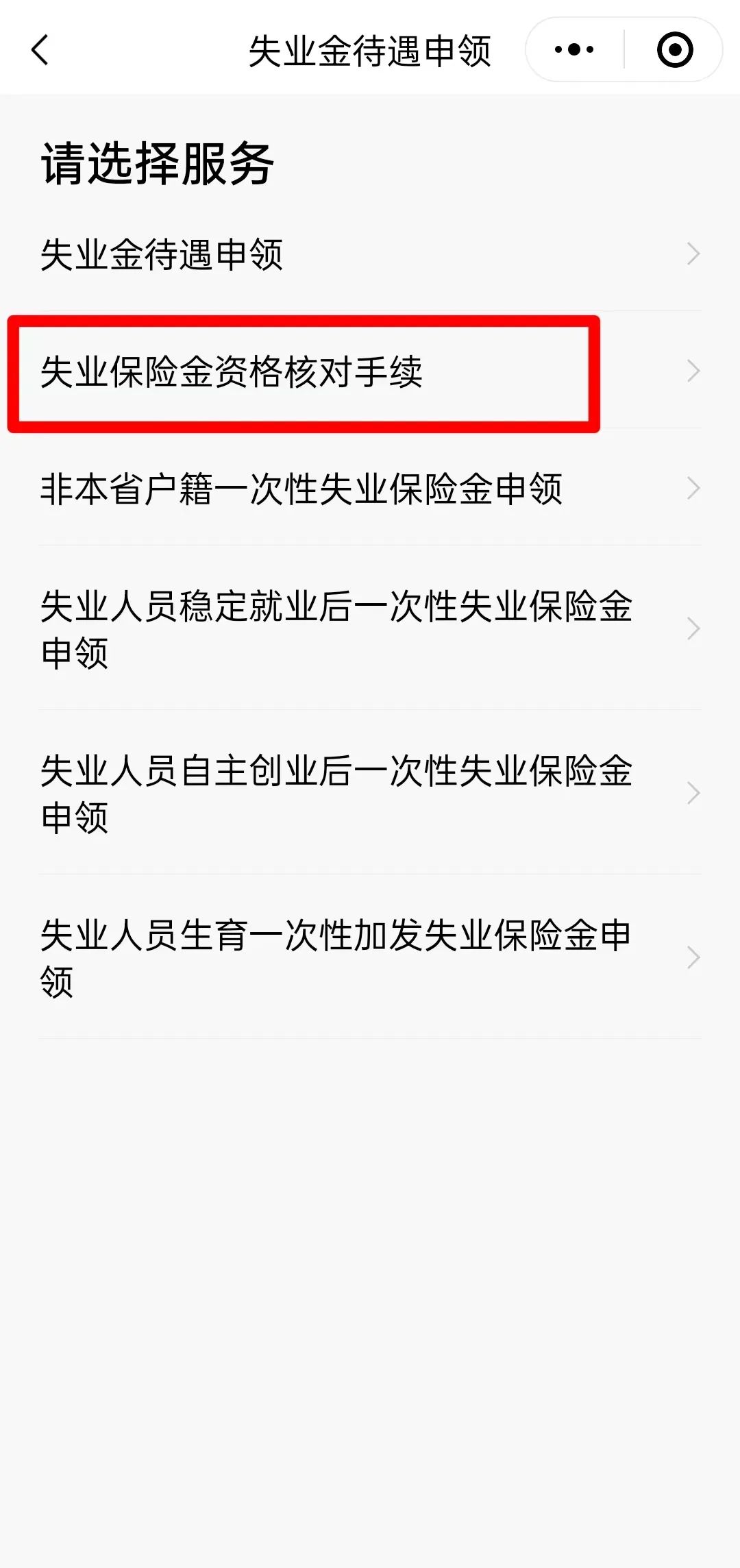 登录小程序,左上角定位选择“佛山市”,依次点击“社保”→“失业”→“失业金待遇申领”,进入菜单目录后选择“失业保险金资格核对手续”,按照页面提示进行操作即可。