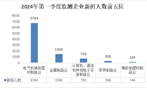 今年第一季度监测企业新招员工总量排行前三位行业分别是电气机械和器材制造业、金属品制造业、计算机、通信和其他电子设备制造业。岗位方面,监测企业发布的岗位当中最紧缺的工种前三位依次是一线生产工、专业技术人员、服务人员。紧缺工种与上季度一致,需求人数总体呈增长态势。