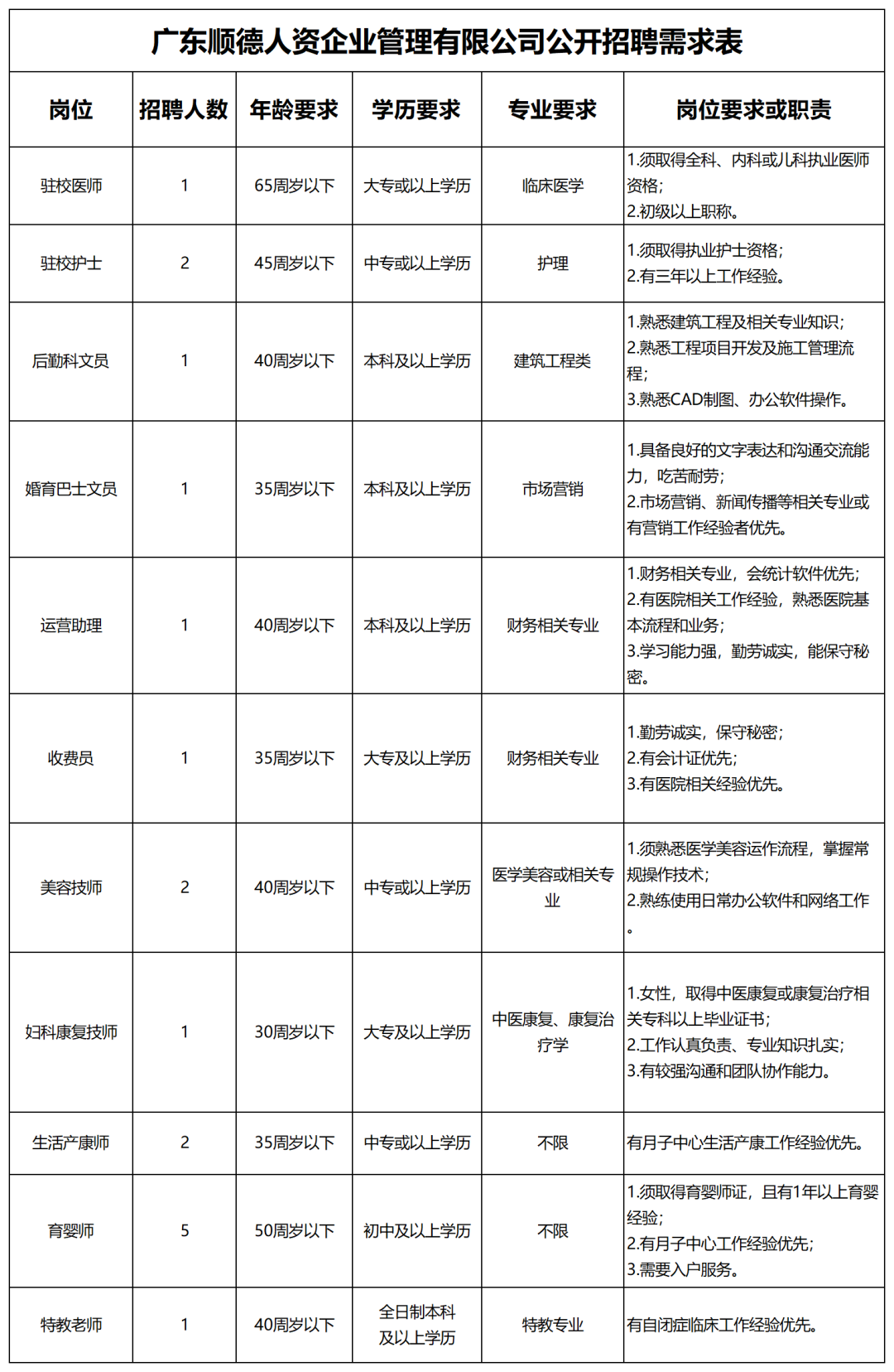 广东顺德人资企业管理有限公司(以下简称“顺德人资公司”),是一家人力资源综合服务单位,主要从事企业管理咨询、人力资源咨询、劳务派遣、劳务外包、代办社会保险等服务,现顺德人资公司因业务合作拓展的需要,拟面向社会诚聘18名工作人员派遣到广东医科大学顺德妇女儿童医院(佛山市顺德区妇幼保健院)。具体如下: