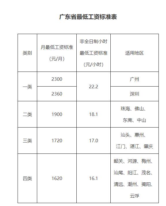 其中,广东省月最低工资标准方面