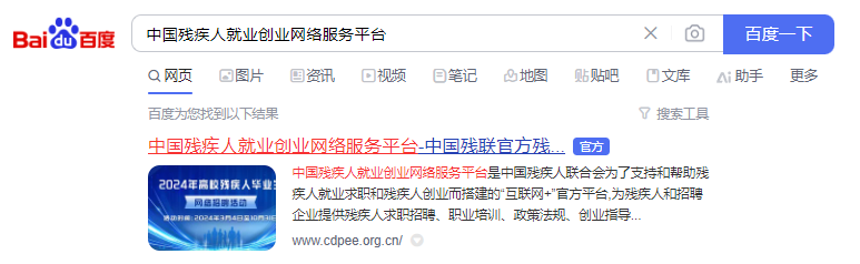 (一)百度搜索“中国残疾人就业创业网络服务平台”。