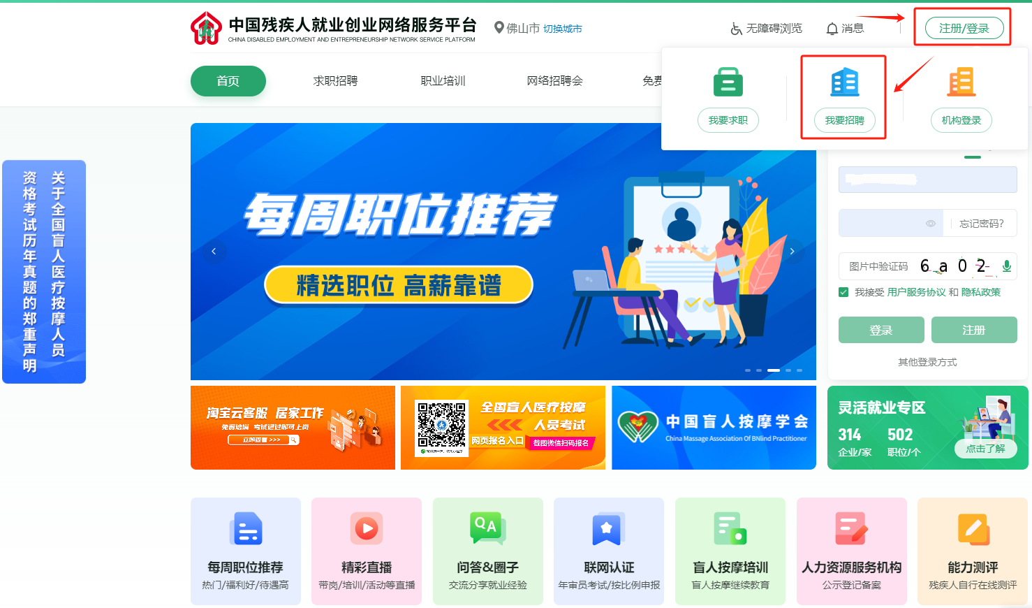 (二)进入官网,点击“注册/登录”-“我要招聘”。