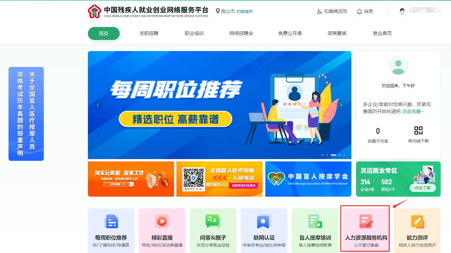 (四)登录后,重新点击“首页”,点击进入“人力资源服务机构”板块。