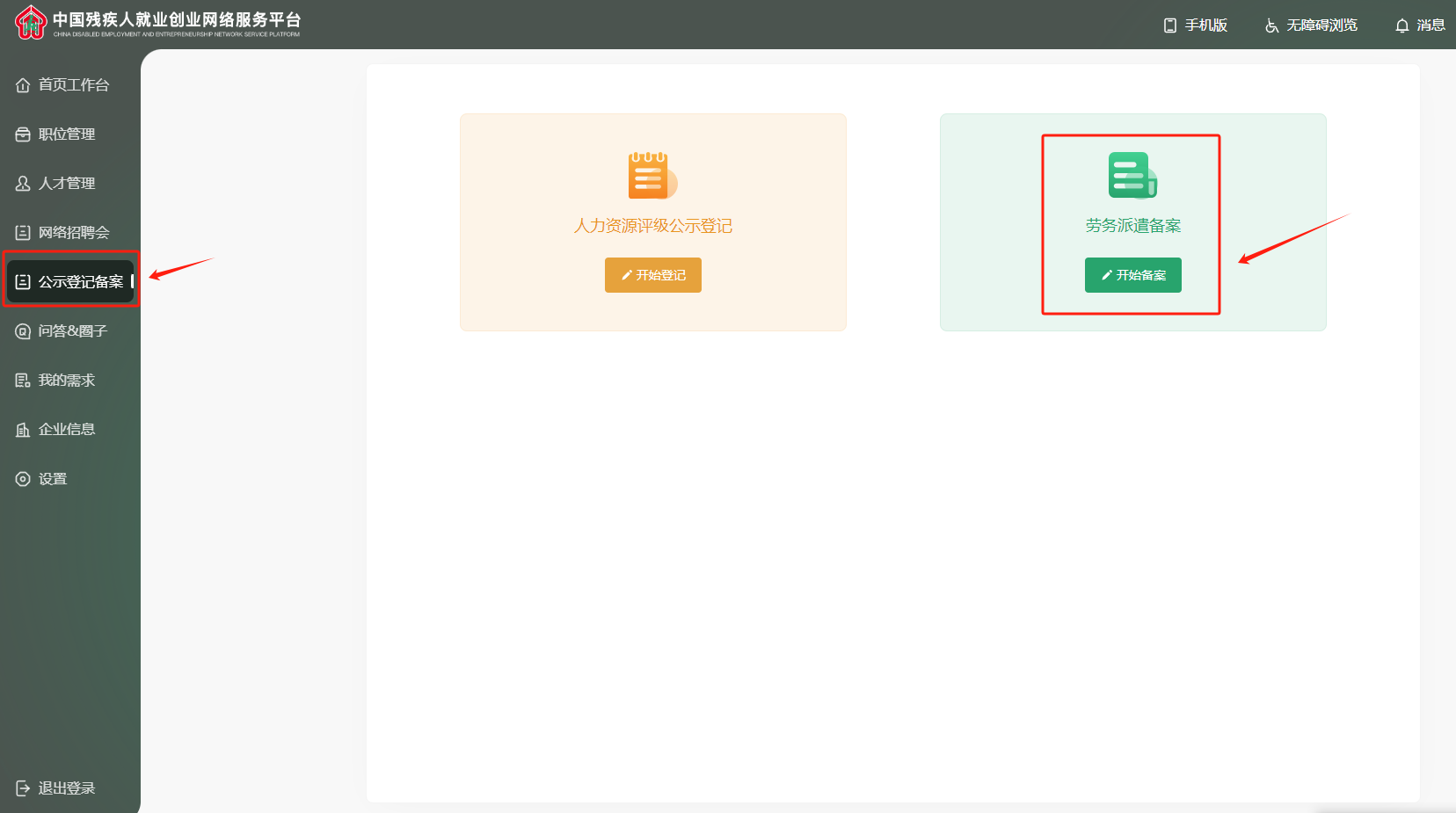 (五)在“人力资源服务机构”板块,点击“公示登记备案”-“劳务派遣备案(开始备案)”。