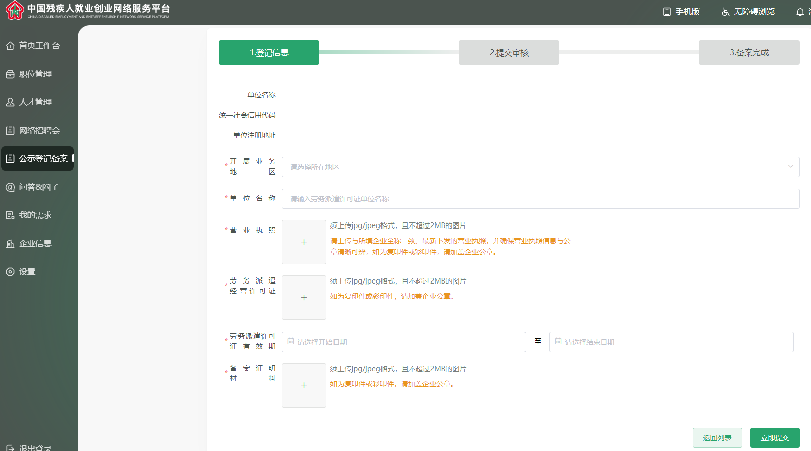 (六)按页面提示,如实填写“开展业务地区”、“单位名称”、“劳务派遣许可证有效期”等信息,并上传“营业执照”、“劳务派遣经营许可证”、“备案证明材料”等电子材料,然后“立即提交”,等待审核。