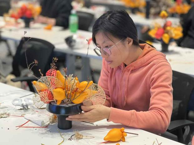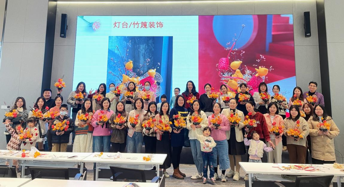 本场充满传统韵味与新春气息的花艺活动吸引了41位优粤佛山卡人才热情参与。五代果闪耀着金灿灿的光芒,独特的外形与吉祥寓意“五福临门、金玉满堂”。在花艺老师的指导下,人才们充分发挥巧思与创意,将五代果与竹编灯笼、金红衬花巧妙搭配。长长的红带在作品中蜿蜒,不仅是装饰,更是承载着对蛇年的美好祝愿,共同迎接充满希望与活力的蛇年。