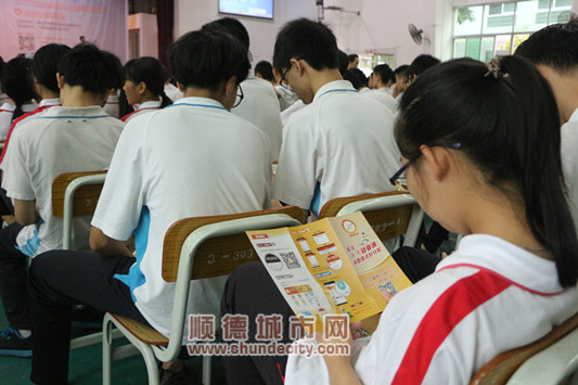 学生认真阅读顺德就业通微信服务平台介绍资料