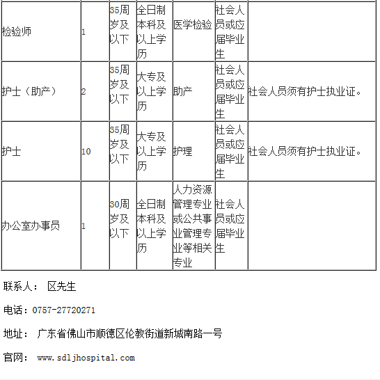 顺德伦教医院公布2017招聘启事了!招聘职位包括内科医师、外科医师、妇产科医师、儿科医师、急诊医师、眼科医师、口腔科医师、耳鼻咽喉科医师、中医师、中医理疗技师(中医按摩)、放射医师、放射技师、B超医师、临床药师、检验师、护士(助产)、护士、办公室办事员。